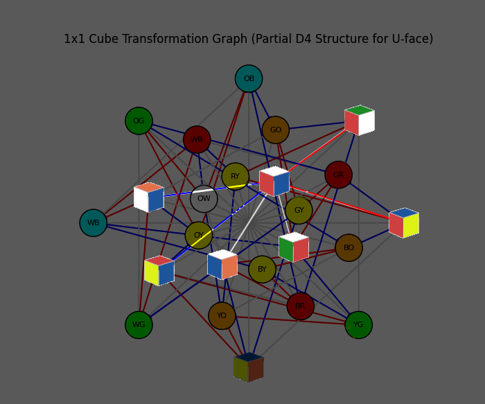 で、その内容を簡単に説明すると、3✕3キューブは複雑すぎるので、1✕1キューブの持ち替え(向きを変える)の全パターンの関係を図示するところまでたどり着きました。